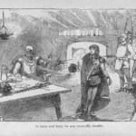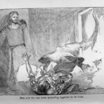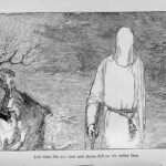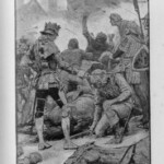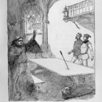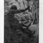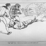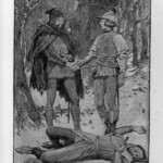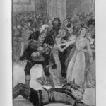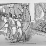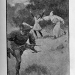 The Black Arrow therefore received four illustrative treatments during his lifetime, two in Britain and two in America: in Young Folks, The Philadelphia Press, and in Charles Scribner’s Sons’ and Cassell and Company’s book editions. The illustrations reproduced here are the book illustrations from the latter two versions. It is interesting to note the contrast in styles of illustration, as Brennan’s illustrations bear close stylistic resemblance to his American predecessor Merill’s for Treasure Island; Paget’s, by contrast, seem more akin to Roux’s pictures in their more naturalistic use of light and shade. The American illustrations favour woodcut designs, where the British illustrations are photographic reproductions of paintings by the illustrators. Stevenson seems to have been uncomfortable with the former design, which emphasises the drama through a stark linear style. Illustrations for future American publications, of which Stevenson generally approved, reverted to Paget’s more painterly style, particularly those by William Hole for The Master of Ballantrae, and Gordon Browne for “The Beach of Falesa”. The illustrations for all four versions of The Black Arrow cover all the various styles of illustration that Stevenson’s works were subsequently subject to, and demonstrate among other things the variety of pictorial possibilities that his prose opened up for potential illustrators.