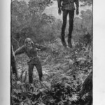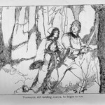 Stevenson’s reaction to Merill’s illustrations to Treasure Island had been less than complimentary. Writing to Charles Scribner from Saranac Lake in October 1887 about a new edition of Treasure Island, he advises, “Should you get Treasure Island, remember to sack the disgusting American illustrations; and get from Hetzel, Roux’s very spirited pictures…”.[iii] This comment may appear on the surface to be somewhat anti-American; however, as Stevenson moved ever further west and south in his travels, he still pushed for the illustration of his work, and Scribners was more than happy to oblige. In the same letter quoted above, Stevenson mentions an American artist he much admired, writing that “Roux is really very spirited, though I wish I had known of [Howard] Pyle, for the French faces jar”. Pyle was an illustrator for Scribners, who wrote and illustrated his own children’s books, a feat Stevenson aspired towards (although acknowledging his own limitations as an artist). Another American artist he admired was his good friend William H. Low. Having failed to convince the company to hire Pyle to illustrate both the book form and serialisation of The Black Arrow, McClure offered to serialise The Black Arrow under the title of “Outlaws of Tunstall Forest” in The Philadelphia Press from 25 March 1888, and had Low illustrate the story. One of these illustrations appears as the frontispiece to the American edition (fig. BA-US-1); Stevenson appears to have held admiration for Low’s pictures. Responding to praise for the serialised Black Arrow from the American journalist Talcott Williams, he writes, “I liked your kind praise; and the whole business—récalme, pictures and cut down story—is entertaining and novel”.[iv]
