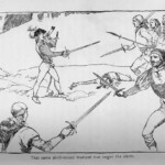 The remainder of the book illustrations are done by Alfred Brennan, another syndicated illustrator for Scribners who would incur Stevenson’s displeasure with illustrations to his final completed story The Ebb-Tide, for Jerome K. Jerome’s To-day periodical in 1894. In the light of this criticism, it is therefore worth noting Stevenson’s uncharacteristic silence in his correspondence regarding Brennan’s illustrations for The Black Arrow. This may be a coincidence of his travelling and various other distractions, but his silence may also be conceived as damning. He is similarly silent on H. M. Paget’s pictures for the British edition. Whatever his feelings on these images, he was bound through distance and nineteenth-century modes of communication to rely on artists and publishers miles away. Stevenson was limited in his influence over the choice of illustrations and illustrators, given his geographic distance from his publishing centres. This is a problem that would come back to haunt him with later publications; in the main, he had to trust to the tastes of his publishers, and the availability of certain illustrators, although he did make recommendations when he could.